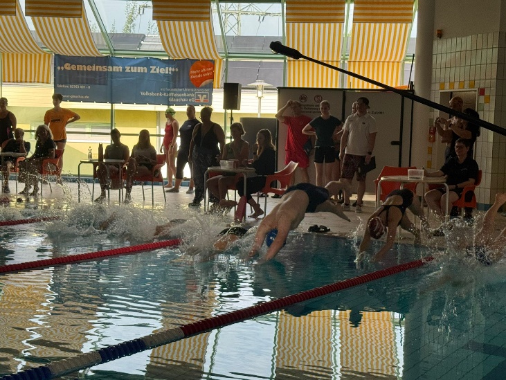 Am 13.09.2025 startete die 25. Ausgabe des 24h-Schwimmens vom STV Limbach-Oberfrohna im Limbomar. Um Punkt 10:00 Uhr begann mit dem Startschuss des Oberbürgermeisters Herrn Härtig der Wettkampf und damit die Umsetzung unseres Zieles, den Sieg der vergangenen Jahre zu verteidigen. Für das ASG gingen dabei 13 Schülerinnen und Schüler der Klassen 5 bis 12 sowie zwei Lehrkräfte der Sportfachschaft an den Start, welche alle jeweils mindestens 3‑mal eine halbe Stunde für die Schule im Wasser waren.